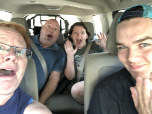 Angus got his driving permit the day before our signing, so Travis and I decided we had a chauffer to take us to the signing. Our son’s first time driving the family. Angus did rather well we thought but when we got there we had to pose in terror! He is taking our ribbing rather well.