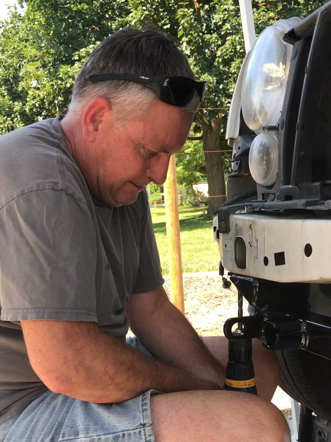 After stringing the wires under and through the jeep we decided it would be easier to install the Base Plate at the same time. We changed gears a little and put the jeep up on ramps and removed the bumper and grill. It was straight forward and fairly easy. The only hard part was drilling extra holes to add the 5th and 6th bolts.