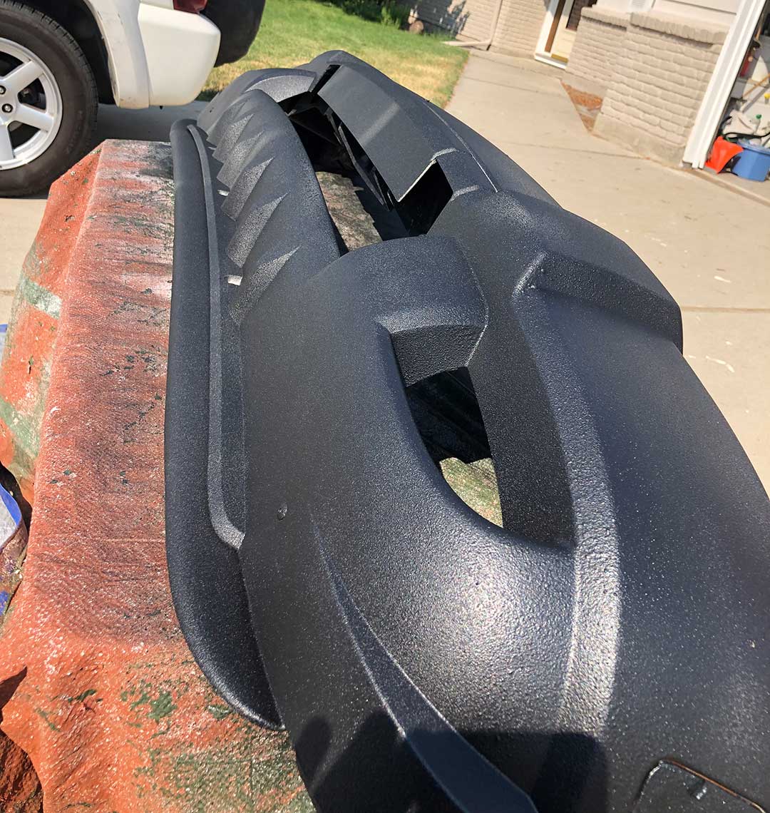 Second Mod: Putting Raptor Liner (truck bed liner) on the Bumper! I used RAPTOR Black UP4883 Bedliner 13.02 Oz 2K Aerosol since I was only doing the bumper. I am going to eventually paint the Whole Jeep in some form of Truck Bed Liner (black and olive green – like my Army HUMMV was!) and this is the first step! It worked awesome, yet I should have got 2 cans instead of only one so there are some places that only got one coat.